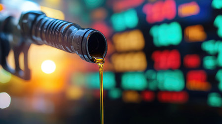 A close-up of a fuel pump nozzle releasing a stream of golden oil against a blurred background of a stock market display, symbolizing energy and finance.