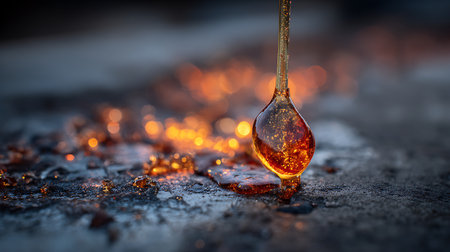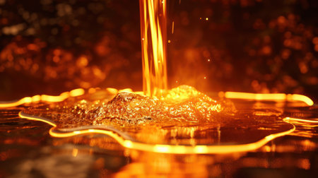 Liquid metal pouring into a glass vessel; Molten streams, metallic gleam.