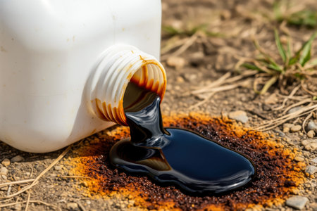 Viscous black oil drips from a white plastic container onto dry, cracked earth, highlighting environmental pollution danger