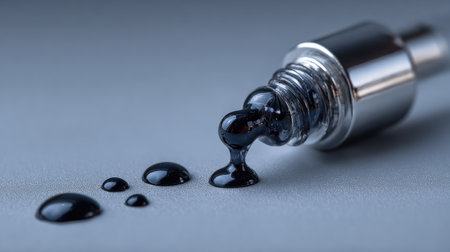 This close-up image presents a container with a dark, viscous liquid spilling onto a grey surface. The glossy droplets create a visually interesting composition, with a smooth texture contrasted by the flowing substance. The lighting suggests an indoor setting, and the image could be used for various commercial and editorial purposes.