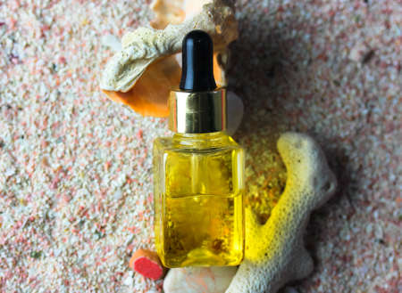 Yellow oil serum essence in glass bottle flatly. Concept of natural cosmetic, trendy beauty skin care. Sunscreen oil to protect the face body at summer days. Sea theme, seashells, stones, pink sand.