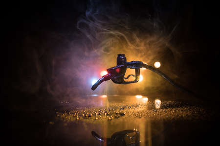 Creative concept. Silhouette of gasoline pistol miniature on dark toned foggy background. Fuel gun close up burning. Selective focus
