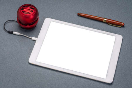 mockup of digital tablet with a blank isolated screen (clipping path included), small speaker connected and a stylish pen against textured paper