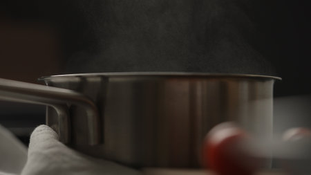 Stainless Steel Pot Boiling Water On Induction Stove Top Steam Rising Kitchen Scene Cooking Process Food Preparation Home
