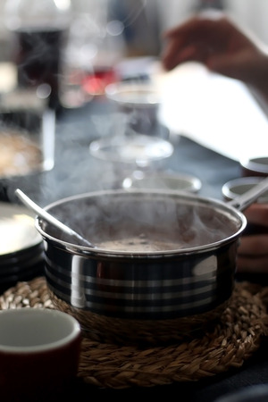 Pouring homemade hot black coffe from large metal pot. Selective focus.