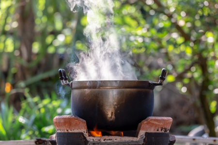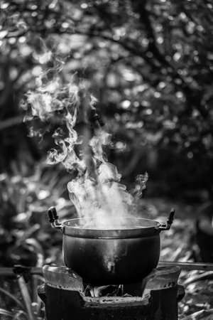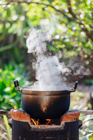 Cooking on the stove in the garden with smoke from the pot