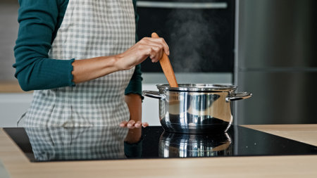 Unknown housewife wears apron prepare food on kitchen surface electric oven cooking aromatic dish boil off soup aromatic borsch by recipe stir porridge with wooden spoon