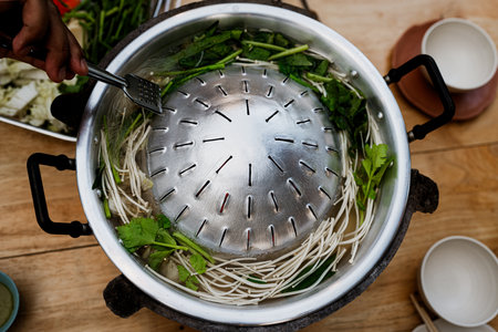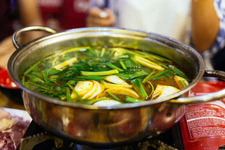 Hot and spicy soup with onion, lettuce and cerely in hot pot at the restaurant in Hanoi, Vietnam.
