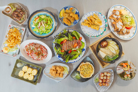 A Japanese meal with sushi, hot pot, salads, fried items, grilled meats, and rice dishes.