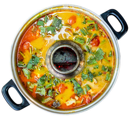 hot Curry orange soup with fish and Mesmerize vegetable Thai food menu in iron pot. a famous Thai food, good heat food from herb vegetable