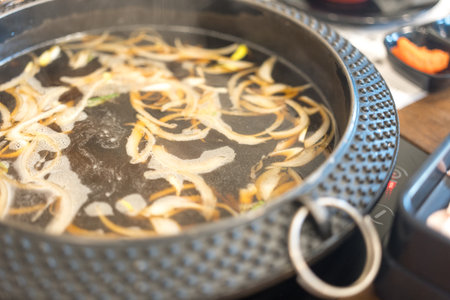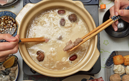 Selective Focused Pot Pouring Soup on Japanese nabemono hotpot dish of thinly sliced meat boiled in water served with dipping sauces, known as Shabu-Shabu. Traditional Japan Soup Food Menu concept
