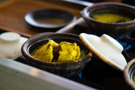 Steamy hot clay pot chicken rice being cooked in restaurant. Popular delicacy in Malaysia
