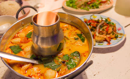 Tom-yum-kung ; Thai spicy shrimp soup in hotpot Top view