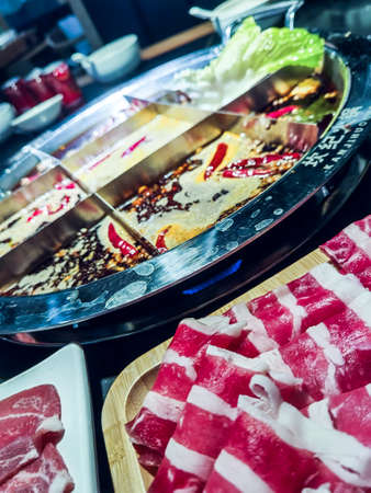 Delicious hotpot with fresh beef and vegetables in restaurant