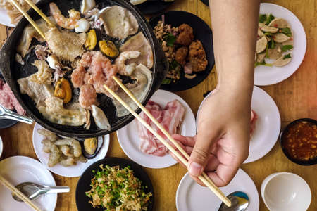 BBQ Barbecue eating. People grilling pork, meal, shellfish and shrimp with wooden chopsticks on hot black pan with oil and butter to cook grilled bbq on a hot stove. Holiday eating at a restaurant.