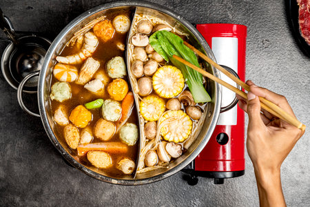 Sukiyaki of two ways in the hot pot. Close up on tom yum soup