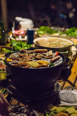 Steaming hot pot with assorted asian dishes