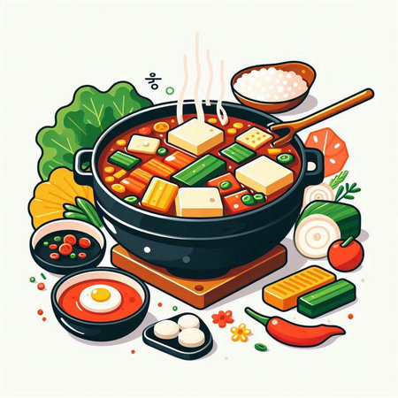 Illustration of japanese hot pot with tofu and vegetables.