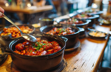 A hand holds a spoon, scooping a portion of meatballs and beans in a rich red sauce from a black serving pot. The pot is part of a buffet line, with other dishes visible in the background. Steam rises from the food, indicating it is hot. The scene is set on a wooden counter in what appears to be a restaurant or catering establishment.