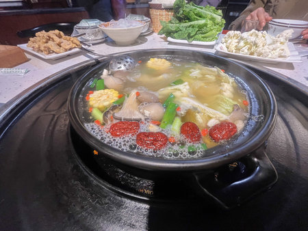 A hot pot soup with mushrooms jujube corn and greens simmering in broth, inviting communal meal scene