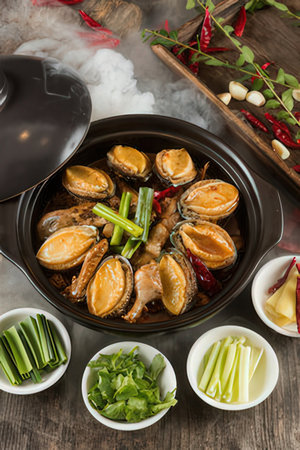 Chinese soup with meat and vegetables in a pot on a wooden table