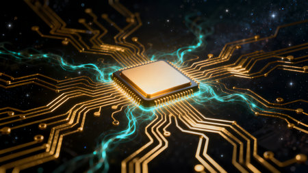 An illuminated microchip surrounded by intricate circuit patterns evoking innovation and technology. The atmosphere is dynamic, suggesting activity and progress.