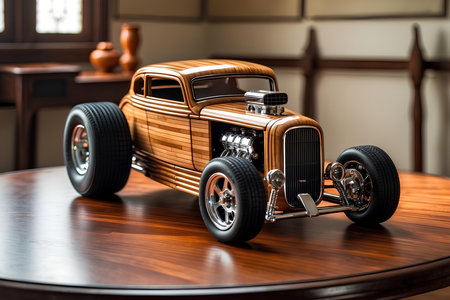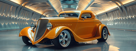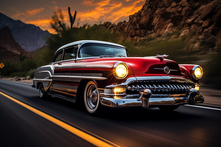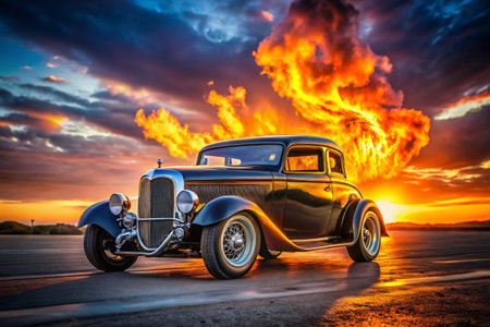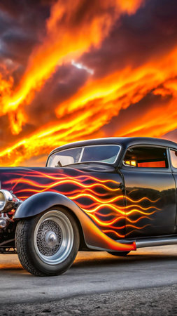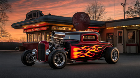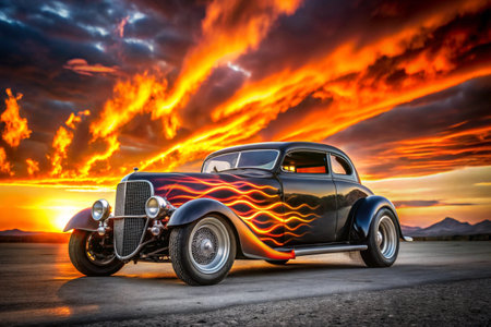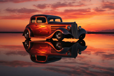 classic hot rod with a sunset reflection on its body, created with generative ai