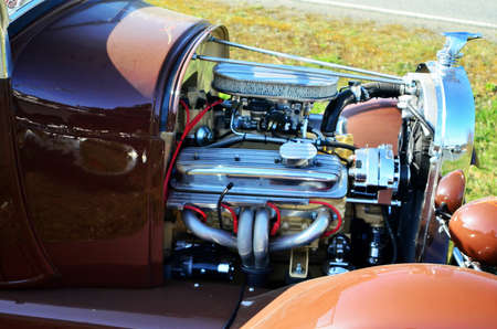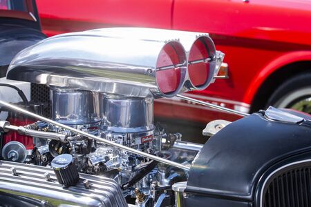Close up of american muscle car engine bay highlighting chrome air intake and vintage power design