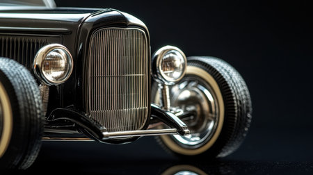 A detailed close-up of the wheels and grill of a vintage toy car on a shiny black background