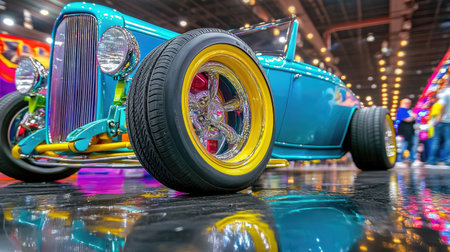 A striking classic hot rod in bright blue and yellow stands out at a car exhibition, featuring remarkable chrome wheels and glossy reflections.
