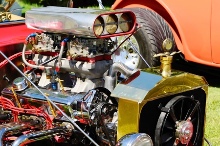 close-up of a hot rods shiny chrome engine, created with generative ai