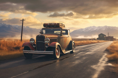 vintage hot rod parked on a scenic route, created with generative ai