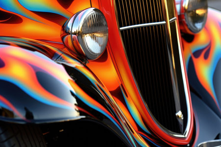 close-up of a hot rods flame paint job on a sleek exterior, created with generative ai
