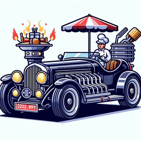 Vintage car with chef and firecracker. Vector illustration.