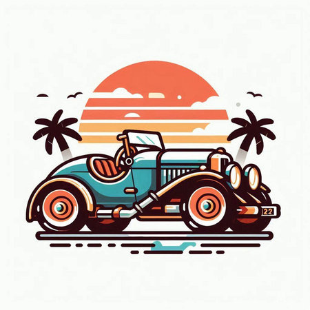 Vintage car poster with sun, palm trees and sunset. Vector illustration