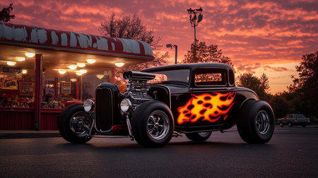 a hot rod with flames painted on the side, parked on a street, created with generative ai