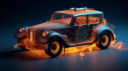 3d rendering of old car with fire flames on dark background.