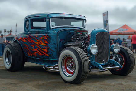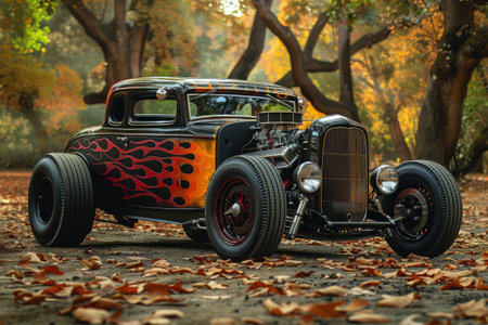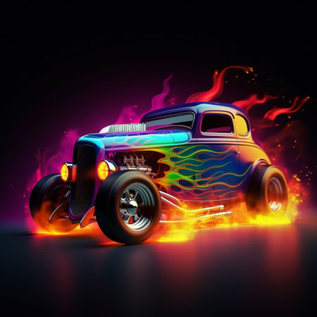 An AI generated illustration of a vintage hot rod car showcased with its vibrant, multi-colored flames