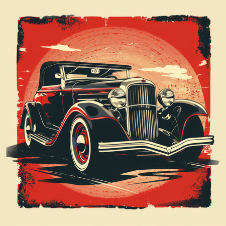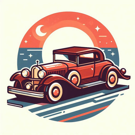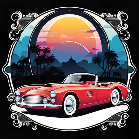 Vintage car silhouette against a large, vibrant red sun