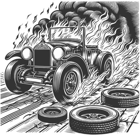 Vintage car on fire background. Hand drawn illustration for your design
