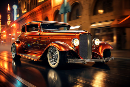 An intensely detailed orange custom hot rod coupe is captured in a dramatic urban setting. The vehicle's chrome accents and powerful engine are highlighted by streetlights and reflections on the wet asphalt.