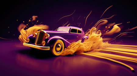 An AI generated illustration of A vintage purple automobile driving on a black, dusty road, creating a cloud of dust in its wake