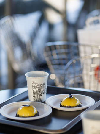 Two glasses of coffee and dessert with yellow icing on a table in a cafe
