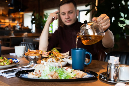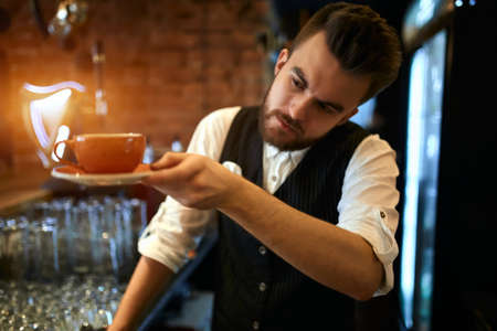 young serious waiter checking a cup of tea before serving it to clients, close up photo