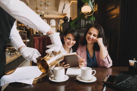businesswomen sit in a cafe, drink coffee and have a business conversation, discuss business and have fun.
