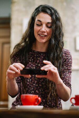 Hand taking a picture of hot latte art coffee cup with art foam on wooden table with her smart phone sitting at a coffee shop snap and share on social media by smartphone. Web Blogger photo shoot concept.