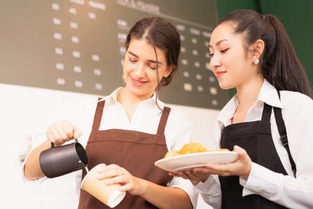 Beautiful caucasian and Asian barista women preparing takeaway hot coffee and bread for customer with menu background in cafe coffee shop. Barista work at coffee bar and food service business