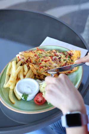 Unrecognizable young woman taking picture of appetizing breakfast on smartphone while sitting at cozy small coffeehouse, focus on foreground