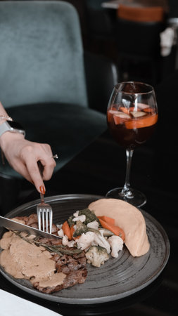 Top-down view selective focus close-up of blogger taking photos of delicious beef steak with bread and vegetable side dish on smartphone camera