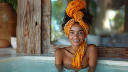 Portrait of a smiling young woman with orange towel on her head relaxing in a hot tub